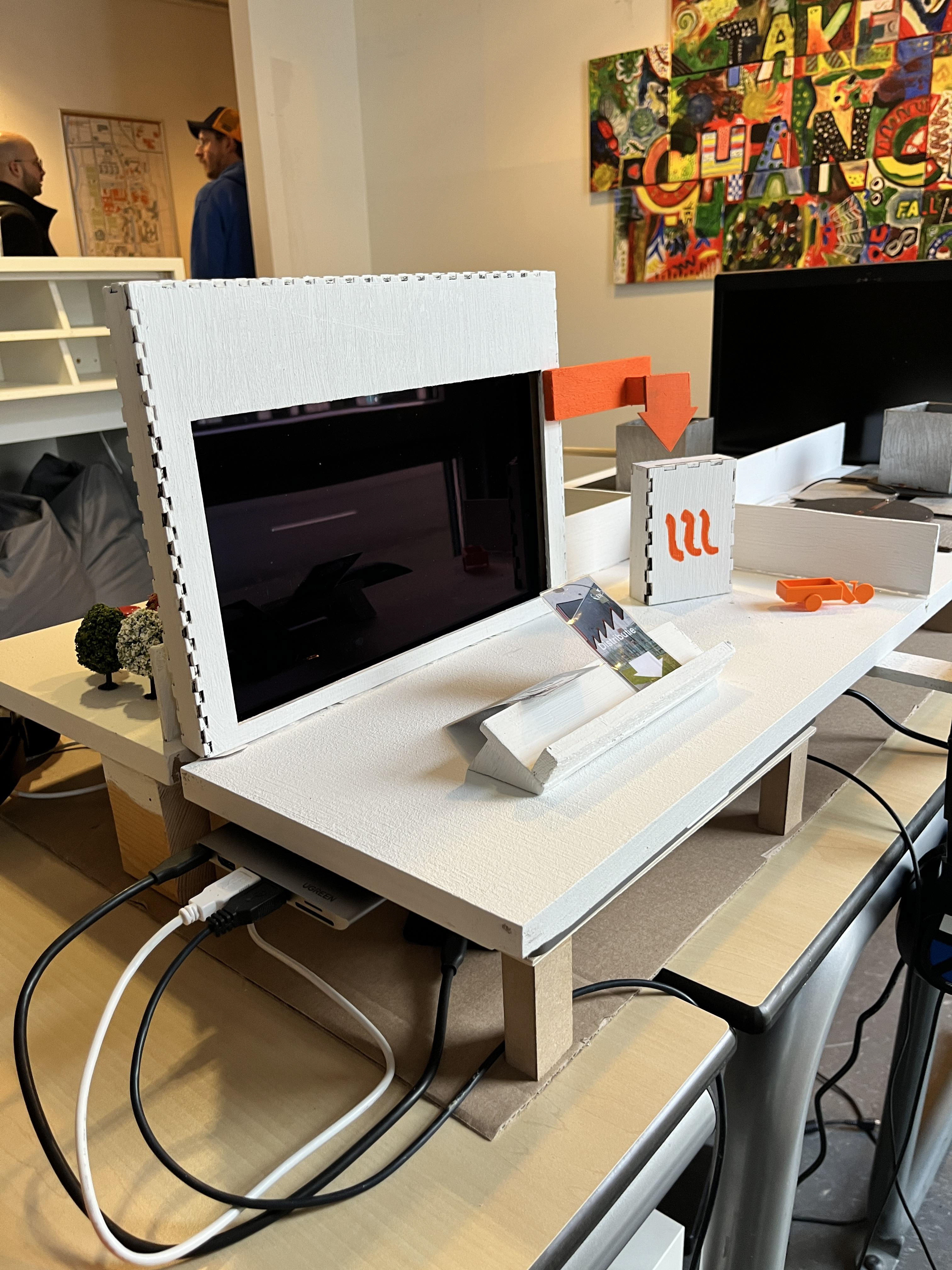 A screen that gives shows explanation videos when a card is put against a card holder, explaining complicated proccesses around the subject of induction stoves.