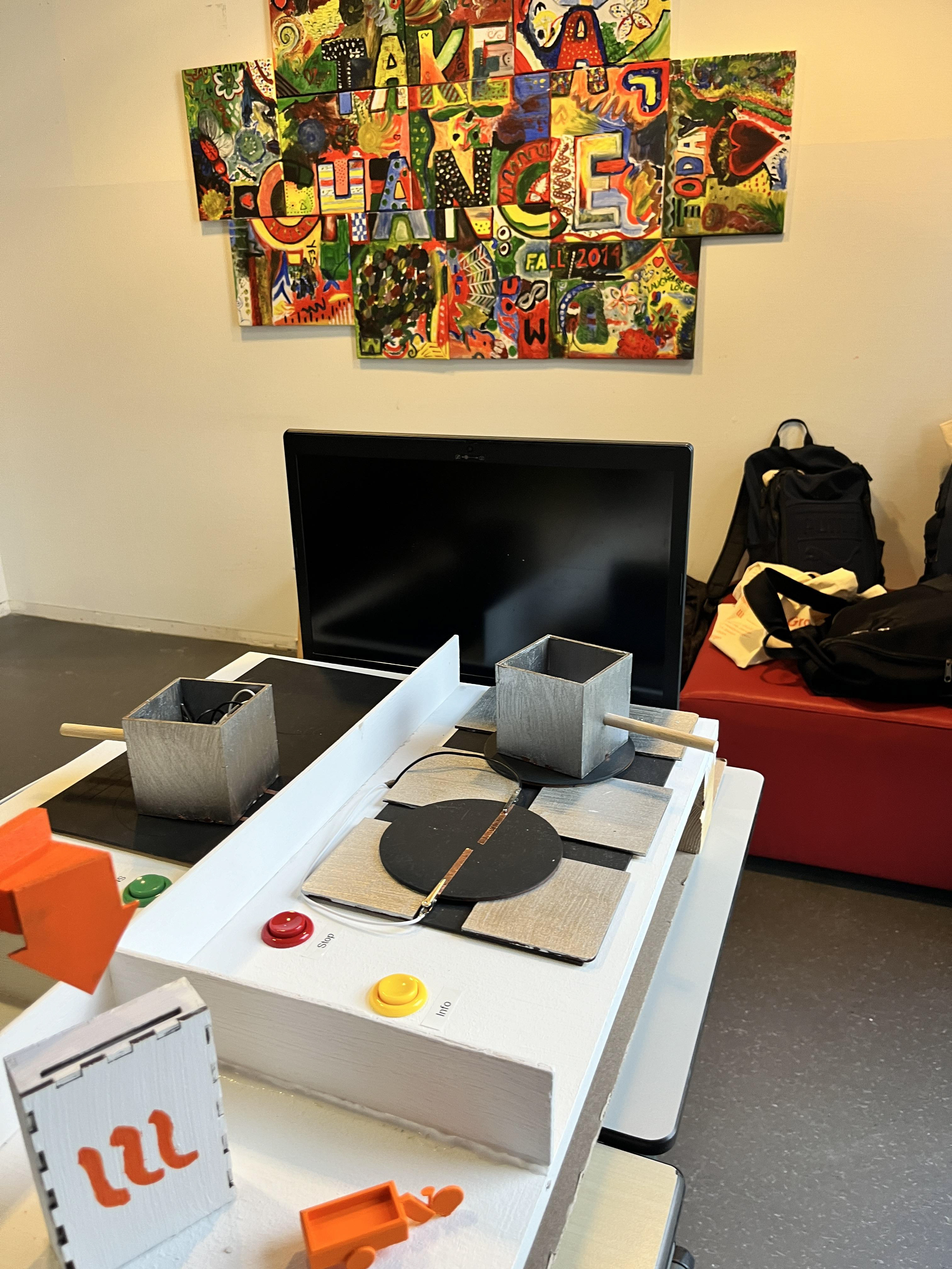 A small scale apartment building that gives explanations of how the procces of the installation of induction stove works, by pressing the colored buttons.