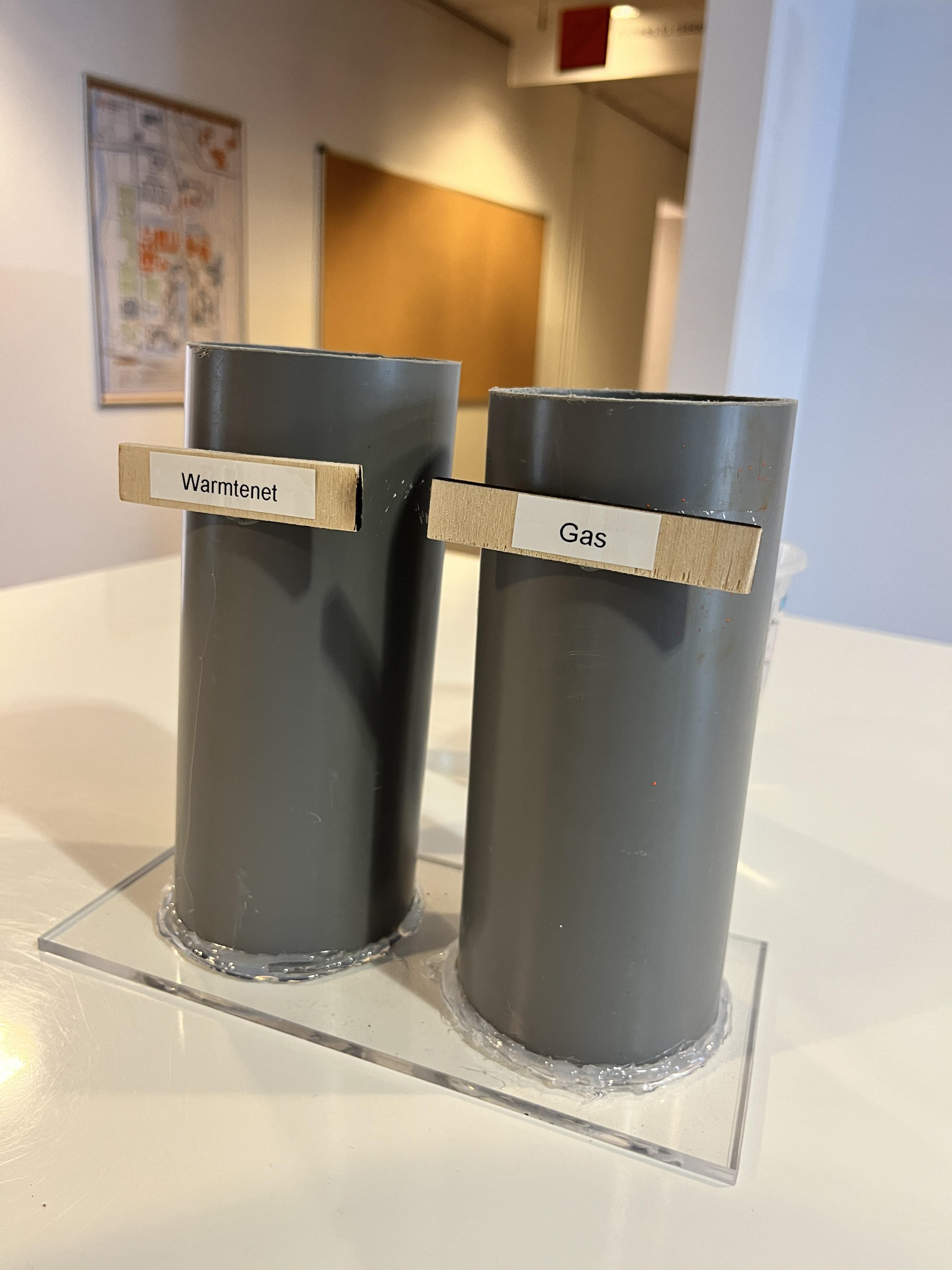 There are two tubes: one labeled “Gas” and one labeled “Warmtenet”(district heating). People receive a cup of water, which they can pour into one of the tubes to vote. If they’re still unsure, they can split the water between both tubes to reflect their doubts.